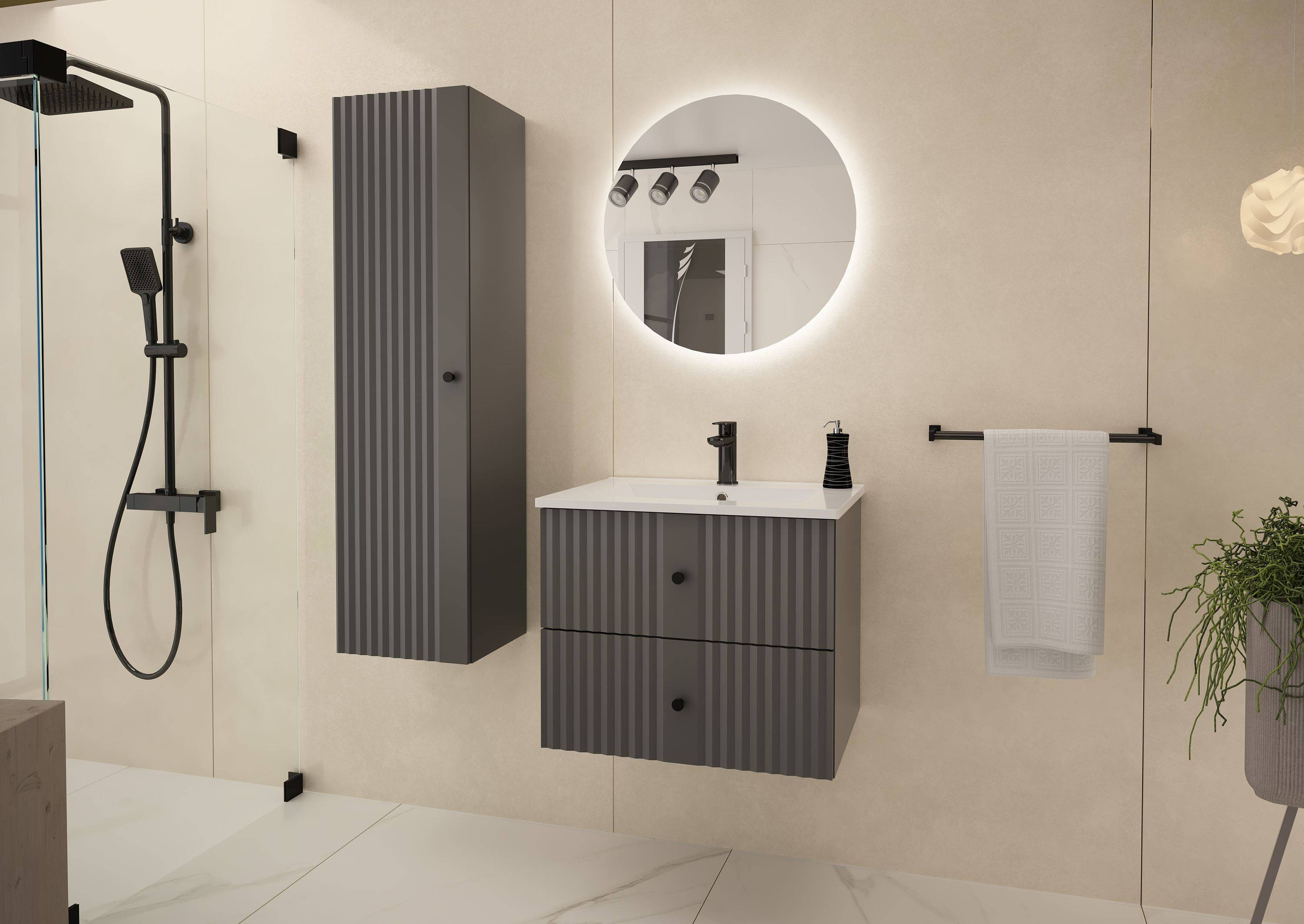 Stylowa szafka z umywalką XILO-02 w nowoczesnym szarym macie. Wykonana z płyty MDF i laminowanej, zapewnia trwałość. Metalowe czarne uchwyty i cichy domyk zwiększają komfort. Umywalka z białej ceramiki sanitarnej.