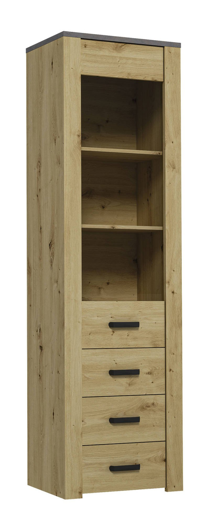 • Witryna jednodrzwiowa o szerokości 57 cm z czterema szufladami i trzema półkami wykonana z płyty laminowanej odpornej na uszkodzenia.