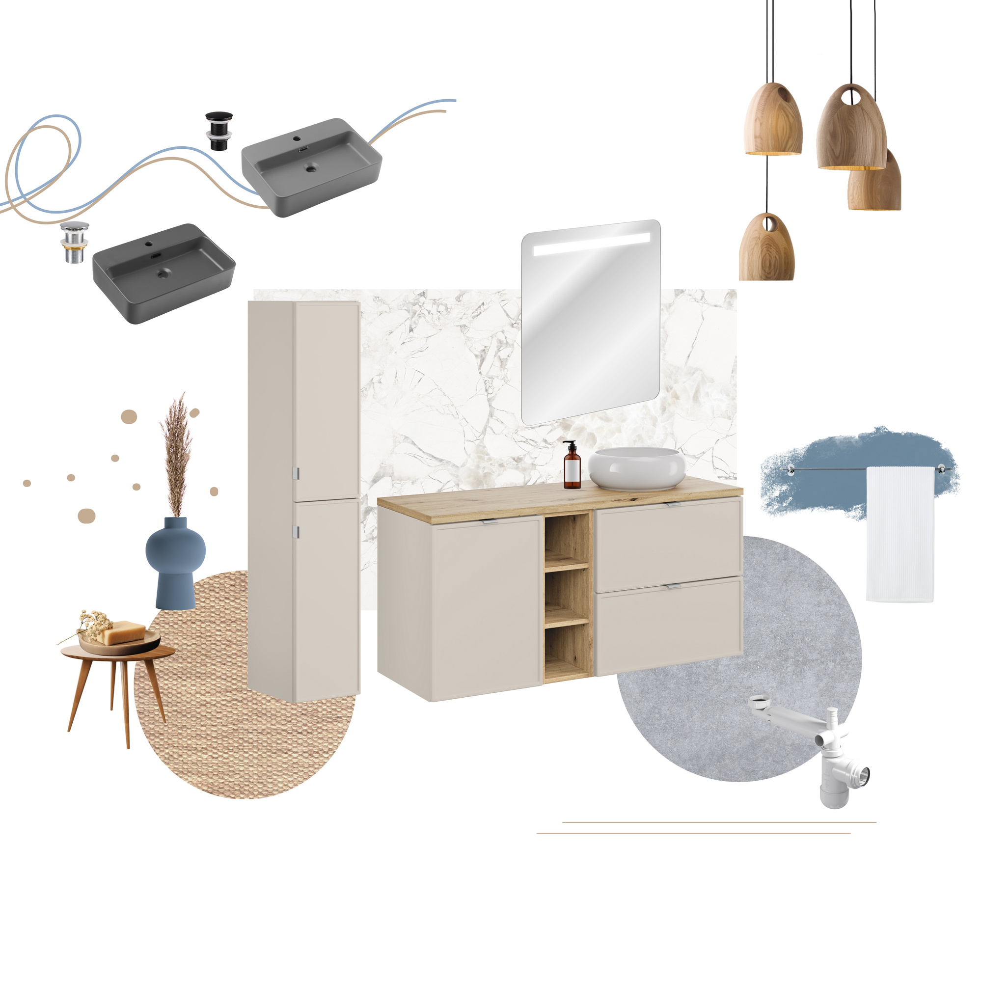 Zestaw Bella Cashmere 120 cm to elegancka i funkcjonalna propozycja do łazienki. W skład wchodzi umywalka nablatowa Smile oraz różnorodne szafki, zapewniające praktyczne przechowywanie. Kolor kaszmirowy mat nadaje wnętrzu nowoczesności.