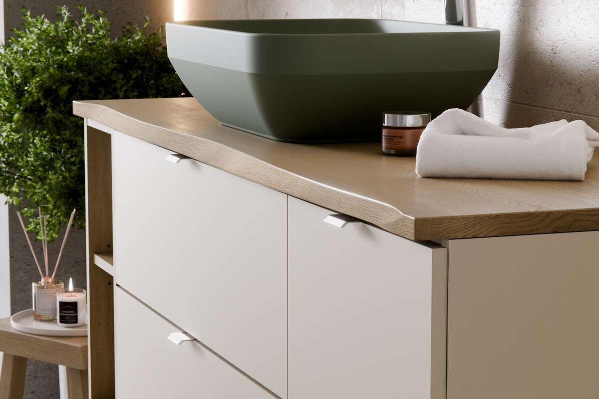 Blat z kolekcji Nature w dekorze Dąb Cremona wprowadza do wnętrza naturalne ciepło i wyjątkowy klimat. Jego delikatnie falowana krawędź, inspirowana strukturą prawdziwego drewna, dodaje autentyczności oraz wizualnej lekkości. To idealne dopełnienie szafki pod umywalkę – estetyczne, trwałe i stworzone z myślą o harmonijnym połączeniu z pozostałymi elementami zestawu.