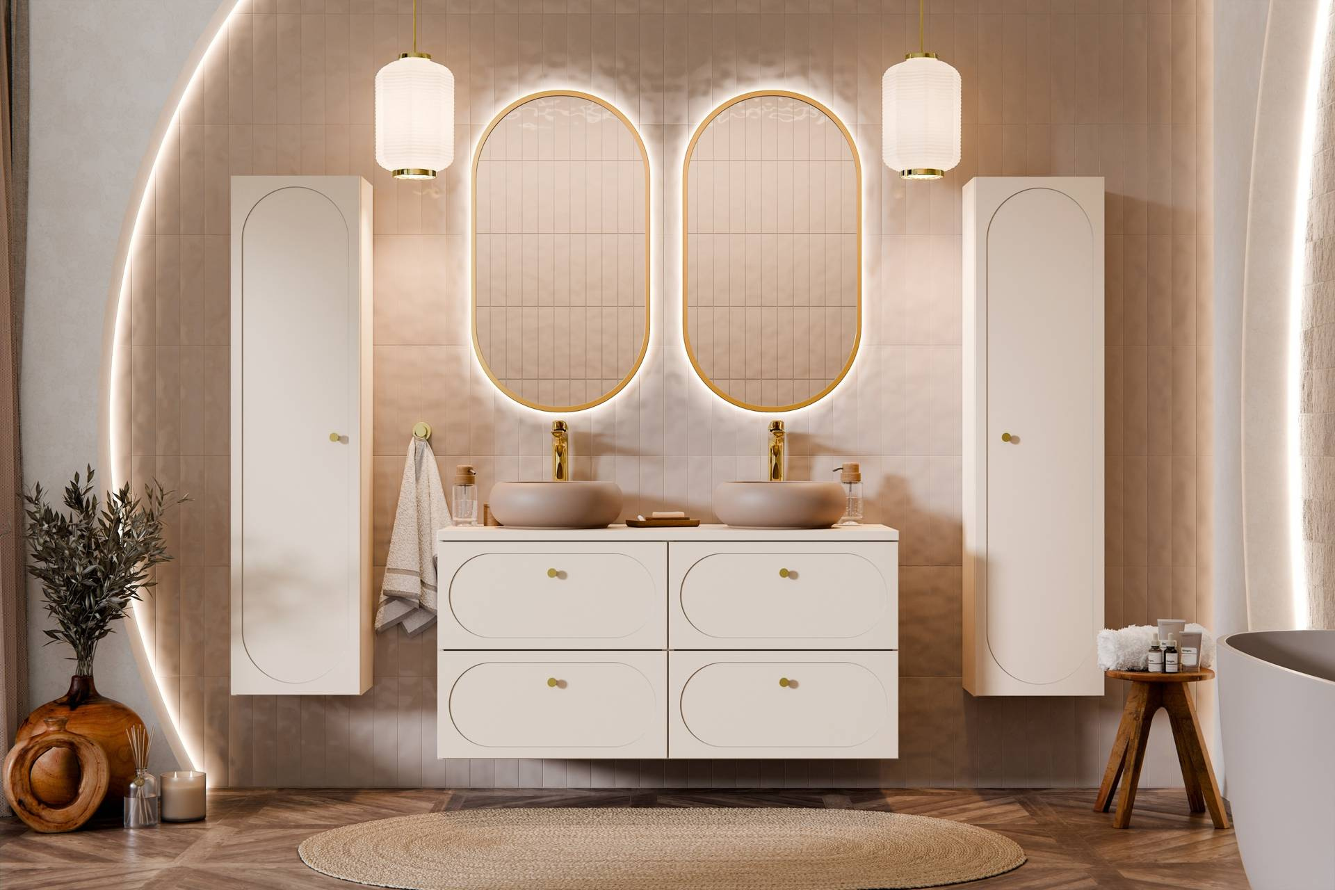 Przemyślany design szafki komponuje się z obłymi frezowaniami frontów, które nadają całemu zestawowi lekkości i unikalnego charakteru. Złote uchwyty w połączeniu z eleganckim kolorem blatu tworzą harmonijną całość, która idealnie wpisuje się w najnowsze wnętrzarskie trendy. Dzięki temu zestawowi Twoja łazienka stanie się nie tylko przestrzenią do codziennych rytuałów, ale również stylowym miejscem, które zachwyca każdego gościa.