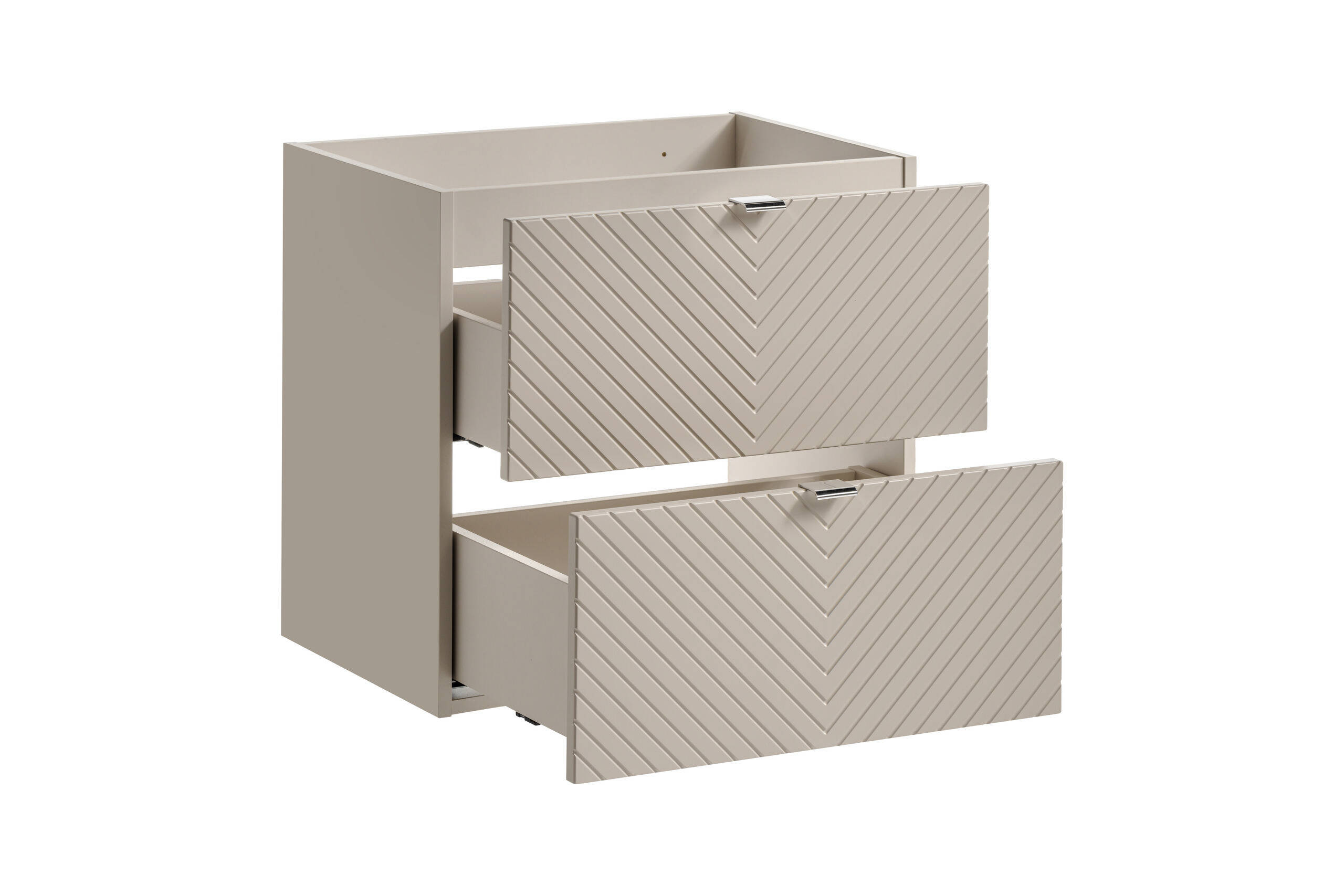 Szafka pod Umywalkę Viva Cashmere 60 cm z frezowanymi frontami w kształcie jodełki, oferuje elegancki styl w połączeniu z funkcjonalnością. Dwie szuflady z cichym domykaniem oraz różne uchwyty dają możliwość personalizacji, idealna do łazienki.