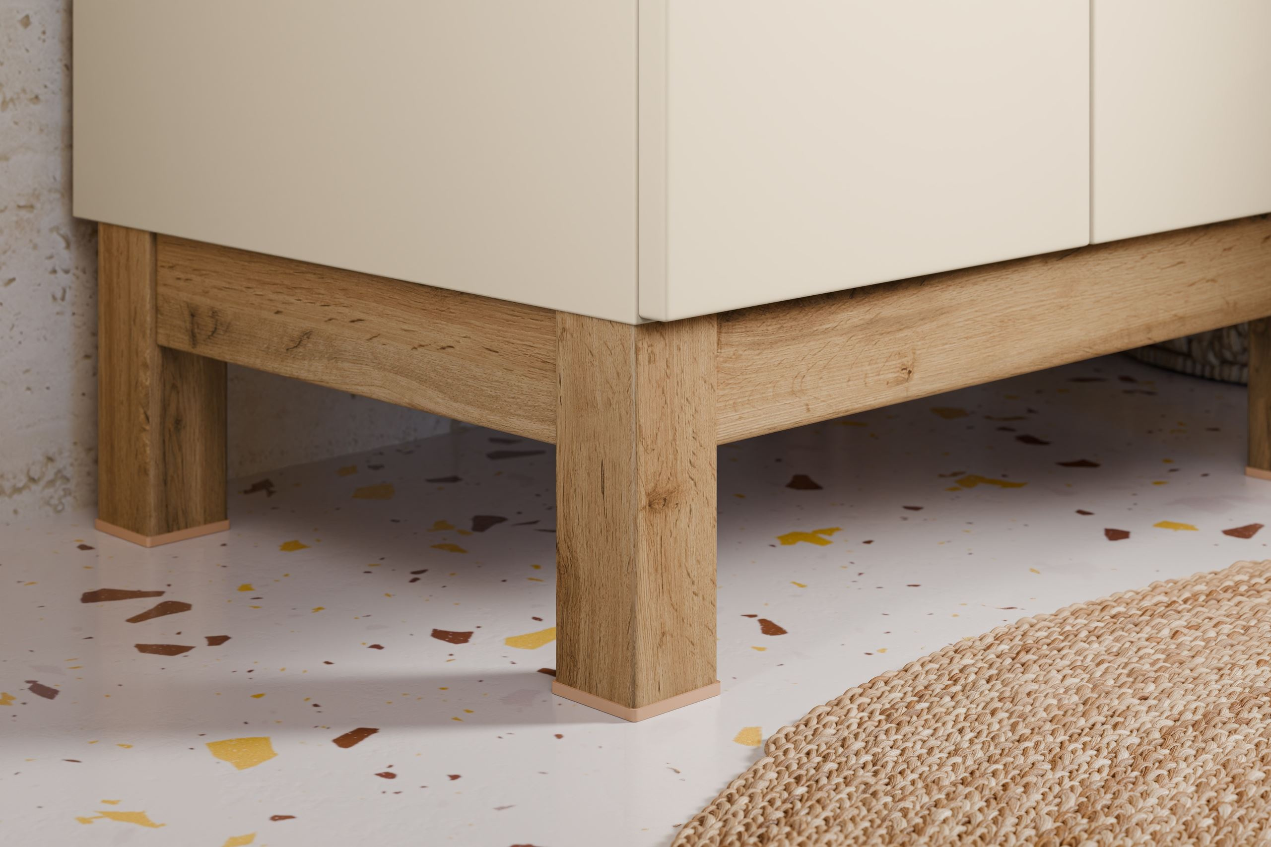 Odkryj Zestaw Szafki Pod Umywalkę Bali Cashmere od marki Comad! Elegancki design w odcieniu matowego kaszmiru z detalami dębu Wotan. Wytrzymała płyta MDF i laminat zapewniają trwałość. Wolnostojący, z cichymi zawiasami i frezowanymi uchwytami.