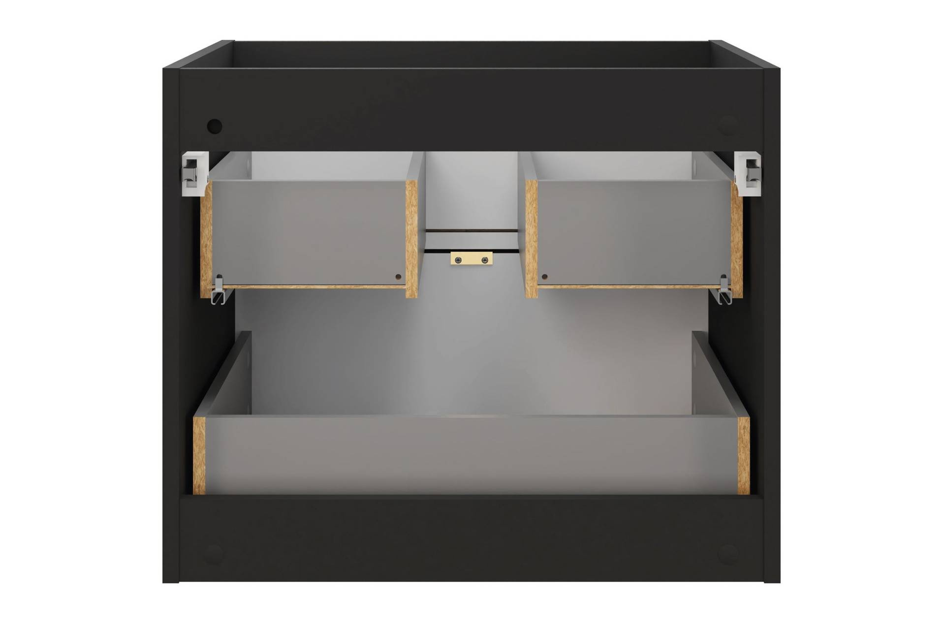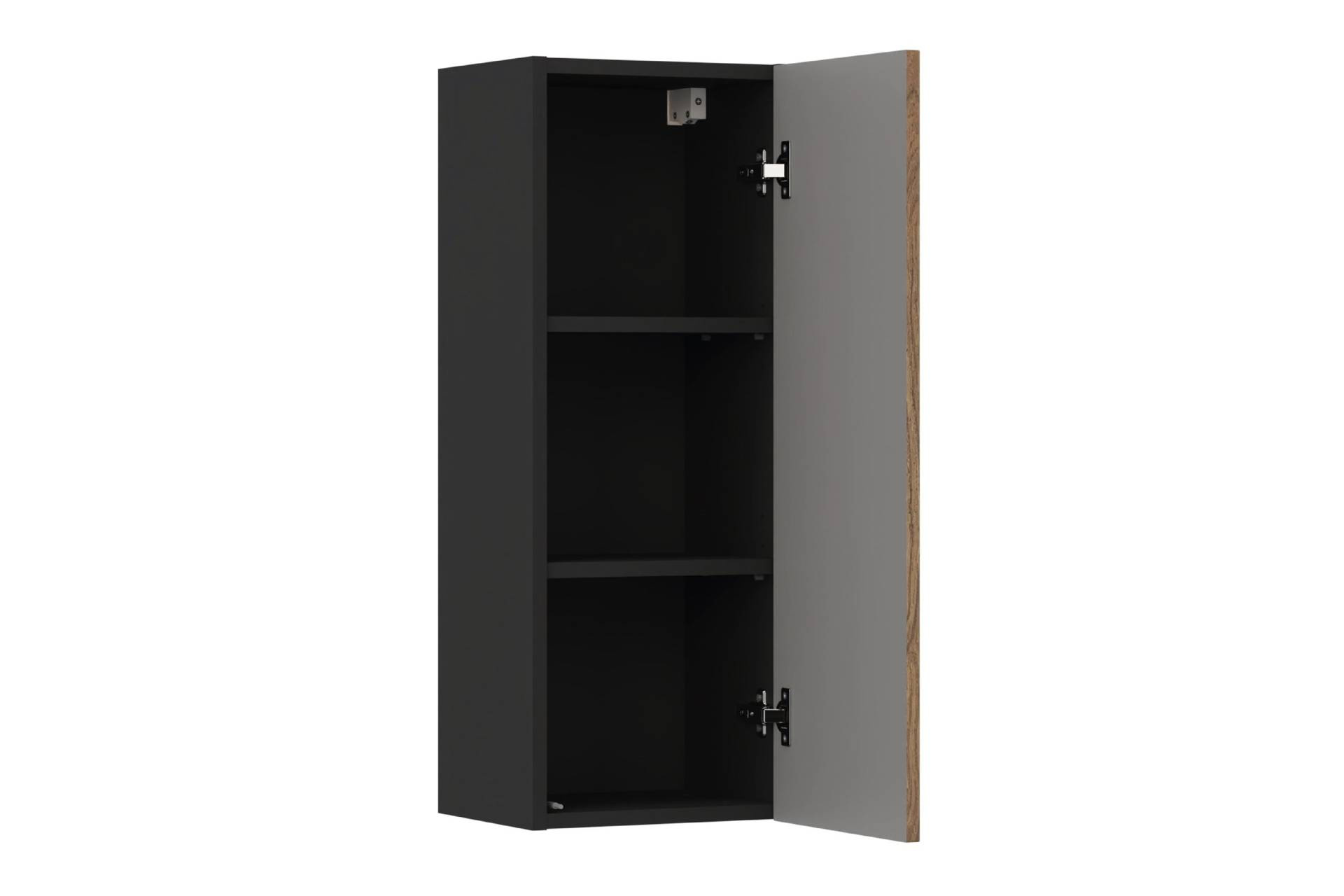 Elegancki zestaw łazienkowy Talia Casella łączy matowy czarny korpus z frontami dąb Casella. Oferuje funkcjonalne dwie umywalki ceramiczne, lustra LED oraz wygodne półsłupki. System cichego domykania wzmacnia komfort.